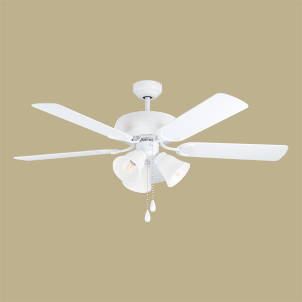 A ventilátor 3 darab fehér, kerek üvegbúrával felszerelt. Húzózsinórral felszerelt, amelyek segítségével be- és kikapcsolhatjuk a világítást. Továbbá segítségével választható ki a 3 különböző sebességből az ideálisat. Minden évszakban hasznos segítséget nyújt a helyiség kellemes hőmérsékleten tartásában, hiszen lehetőség van a nyári és téli üzemmód közötti váltásra is, mivel a forgásirány megfordítható.